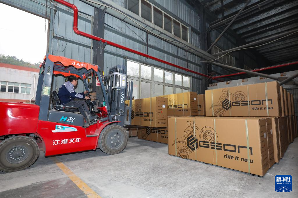 12月2日,在重庆炙焱动力制造有限公司,工人将打包好的摩托车码放整齐等待出口。该公司生产的摩托车主要出口至拉美、东南亚、欧洲等市场。