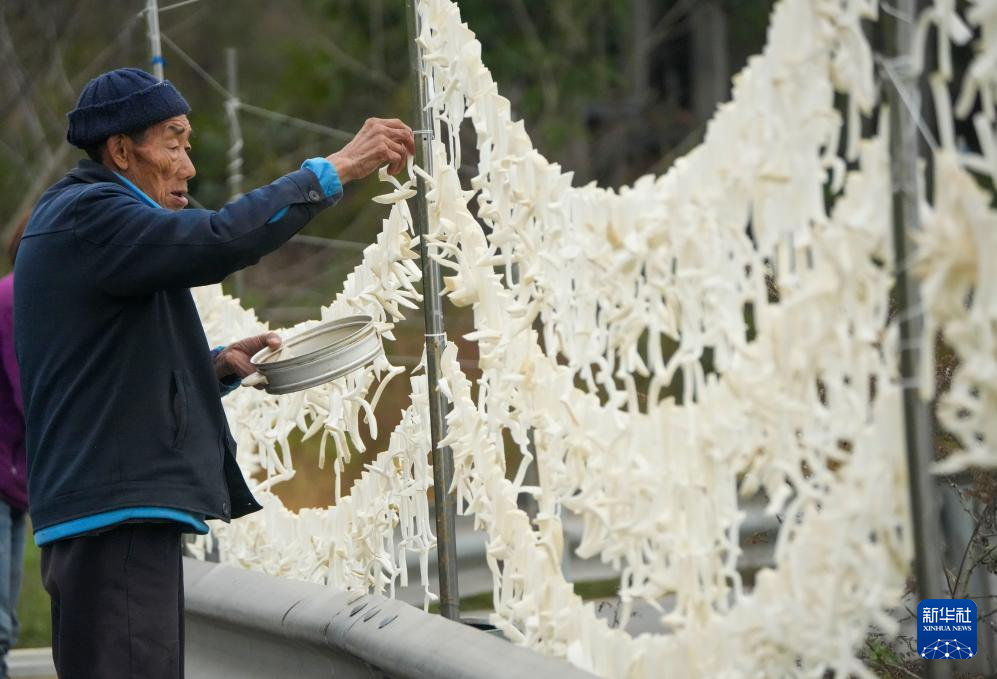 12月3日,在重庆市綦江区赶水镇石房村,农户将采收的草蔸萝卜切条晾晒。