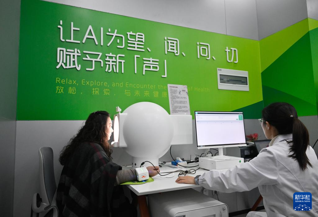 12月4日,在“AI·镜界—南京人工智能生态街区”,一位女士在“AI诊所”进行健康检测。