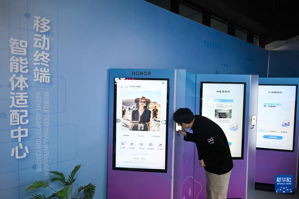 12月4日,在南京人工智能生态街区的“AI·模坊”南京智能体集散中心,工作人员与智能移动终端互动。