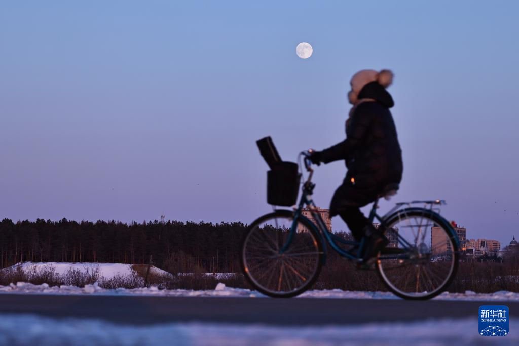 12月4日,在黑龙江省同江市,一位市民在月下骑行。