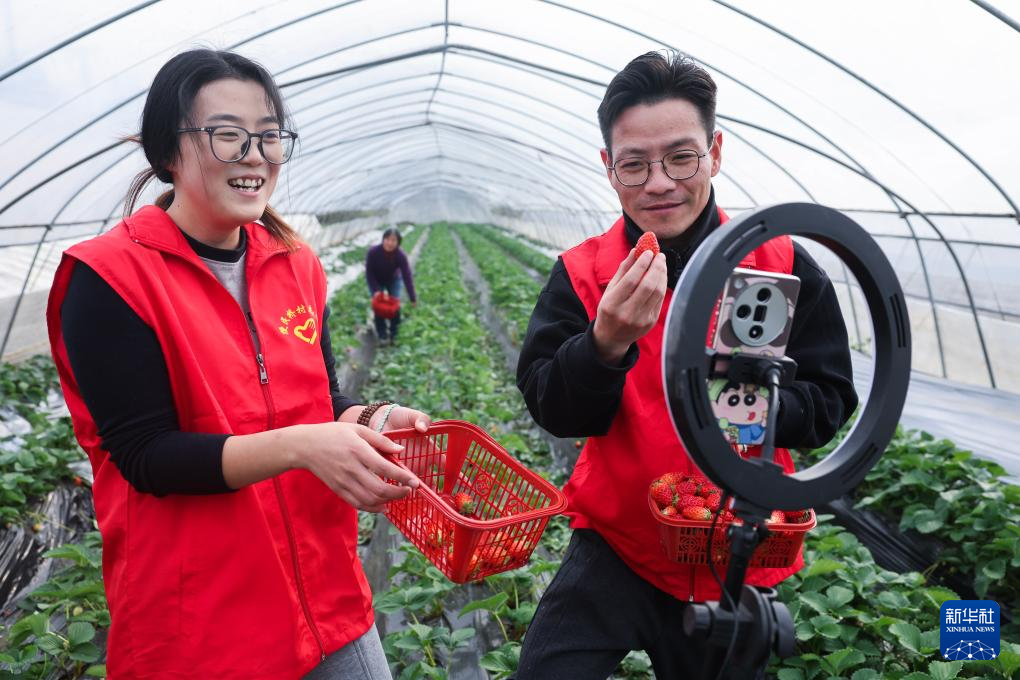 12月4日,党员志愿者在长兴县和平镇便民桥村蜜甜家庭农场大棚内给种植户直播带货。