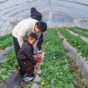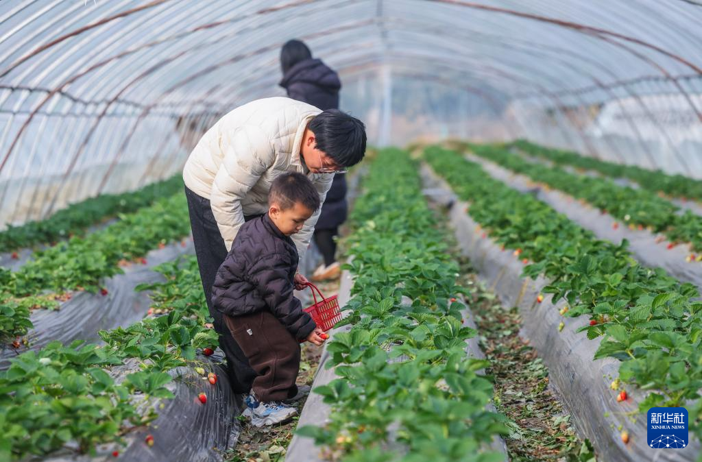 12月4日,游客在长兴县和平镇便民桥村蜜甜家庭农场大棚内采摘草莓。