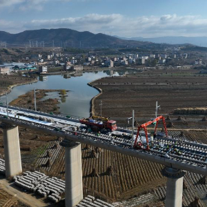 12月7日,在云南省昭通市昭阳区守望回族乡,中铁二局工人在渝昆高铁卡子村特大桥进行无砟道床作业(无人机照片)。
