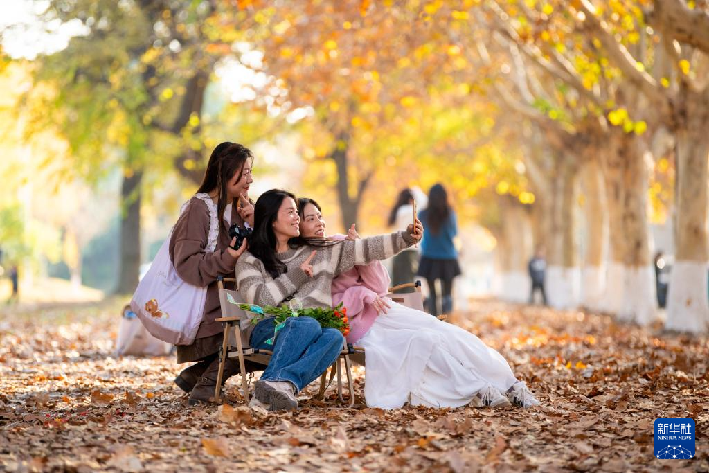 12月7日,游客在江苏泰州医药城梧桐大道打卡拍照。