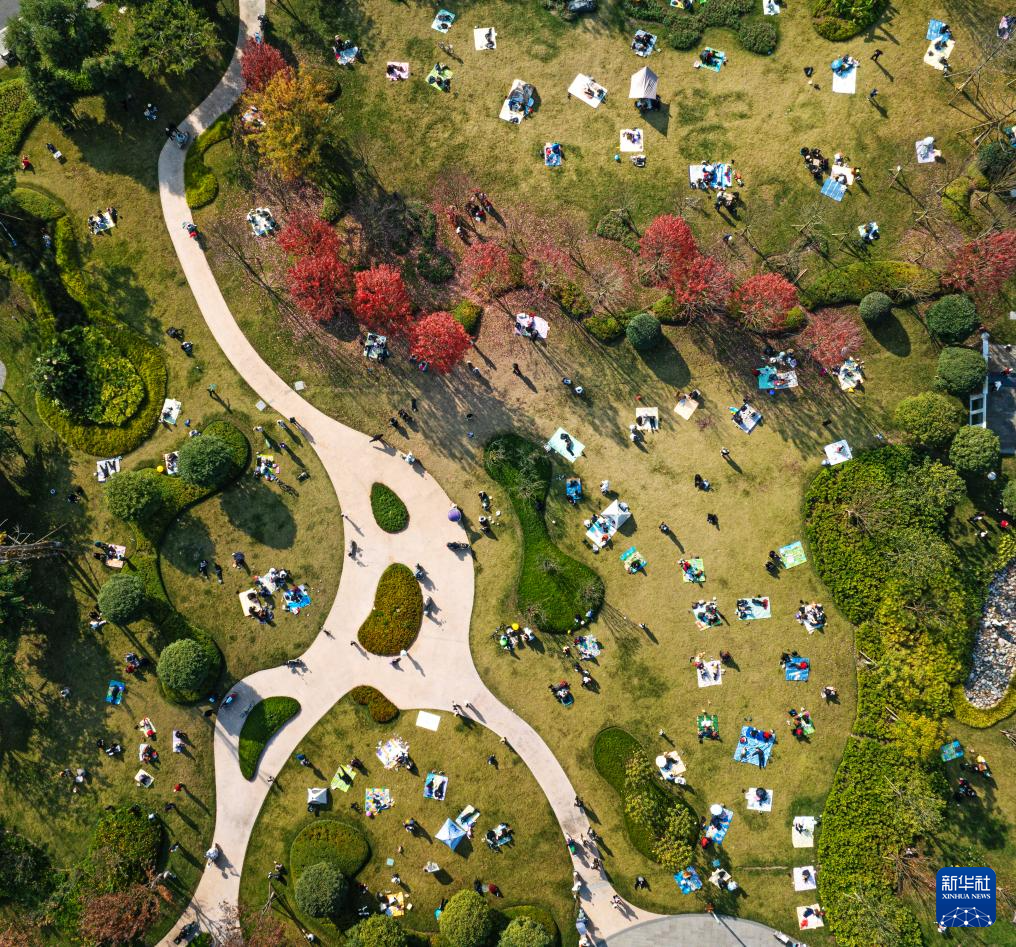 12月7日,游客在四川省乐山市市中区一公园休闲游玩(无人机照片)。