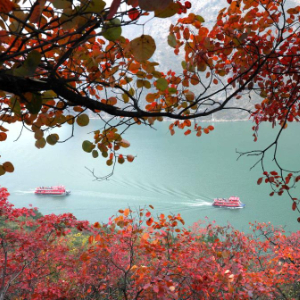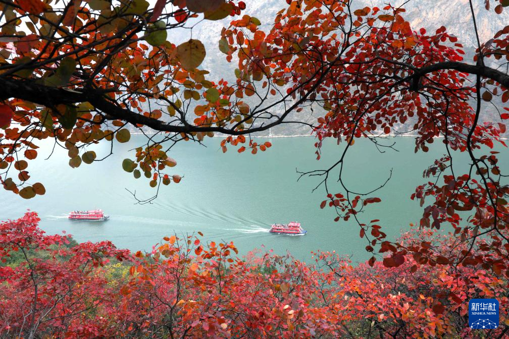 12月7日,船只行驶在红叶映衬下的长江三峡巫峡段。