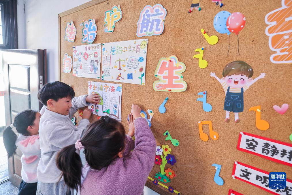 12月9日,诸暨市暨南街道中心学校王家井小学的学生把自己创作的法治宣传画贴到教室的宣传栏中。