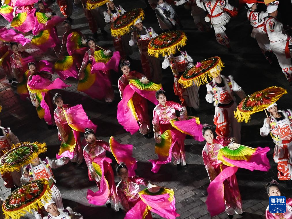 演员在榆林老街非遗大集开集仪式上表演秧歌腰鼓(2023年2月17日摄)。