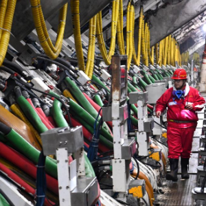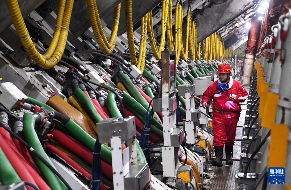 工作人员在陕西陕煤曹家滩矿业有限公司全自动液压支架支撑的采煤工作面巡检(2024年2月29日摄)。