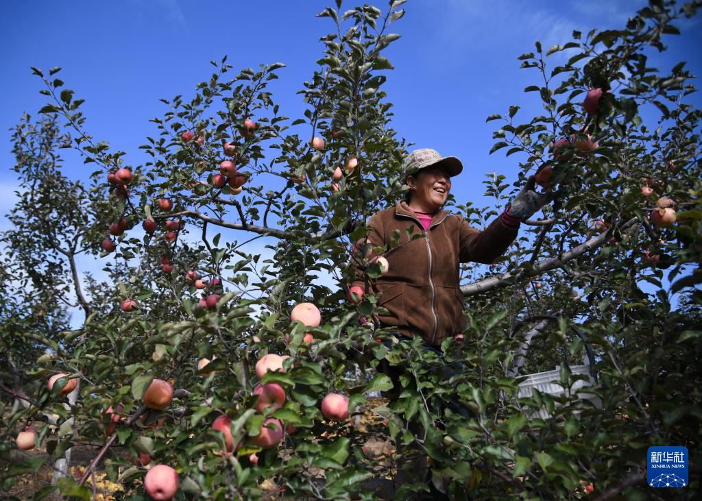 果农在陕西省榆林市横山区赵石畔镇一处果园采收苹果(2025年11月4日摄)。