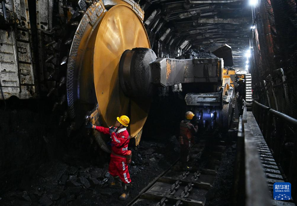 工作人员在陕西陕煤曹家滩矿业有限公司10米超大采高智能综采工作面对采煤机进行检修(2024年2月29日摄)。