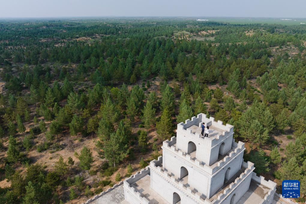 被绿色环绕的榆林镇北台(2024年6月6日摄,无人机照片)。