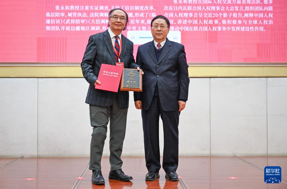 12月10日,西南政法大学人权研究院执行院长张永和(左)获得2025年李步云法学奖。