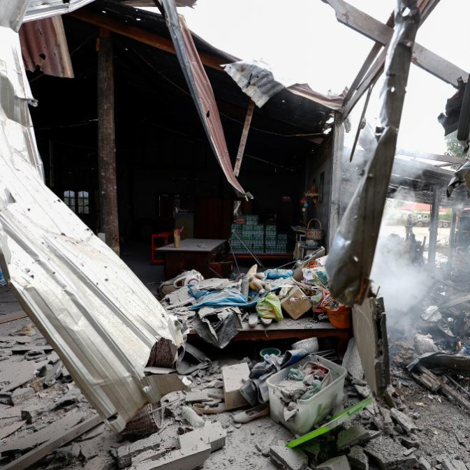 这是12月11日在泰国素林府拍摄的被炮火损毁的房屋。