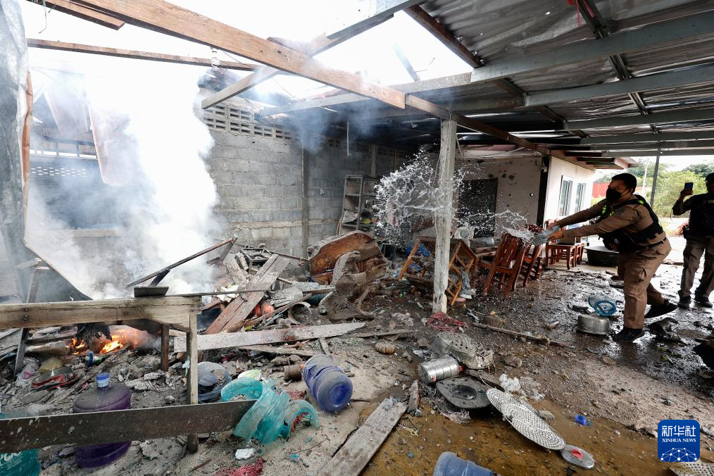 12月11日,在泰国素林府,警察向被炮火损毁的房屋洒水灭火。