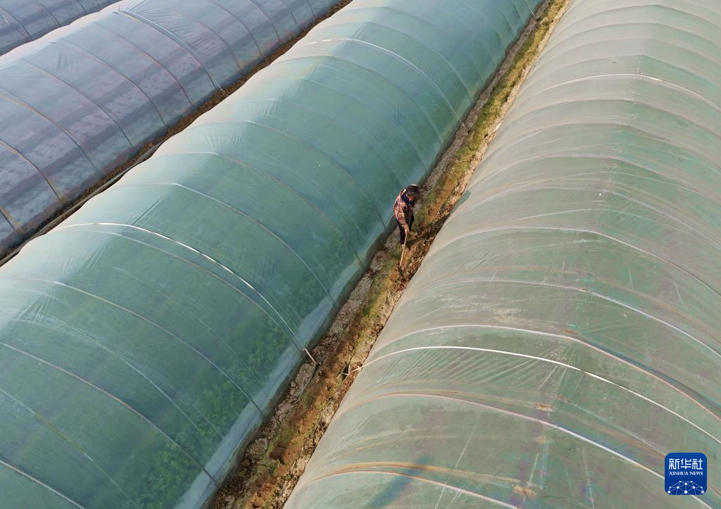 12月10日,河南省南阳市新野县城郊乡吕庄村,村民在蔬菜种植基地对蔬菜大棚进行封土加固(无人机照片)。
