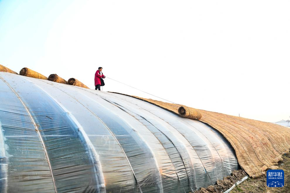 12月11日,河南省济源市思礼镇农民为蔬菜大棚加盖保温草帘。