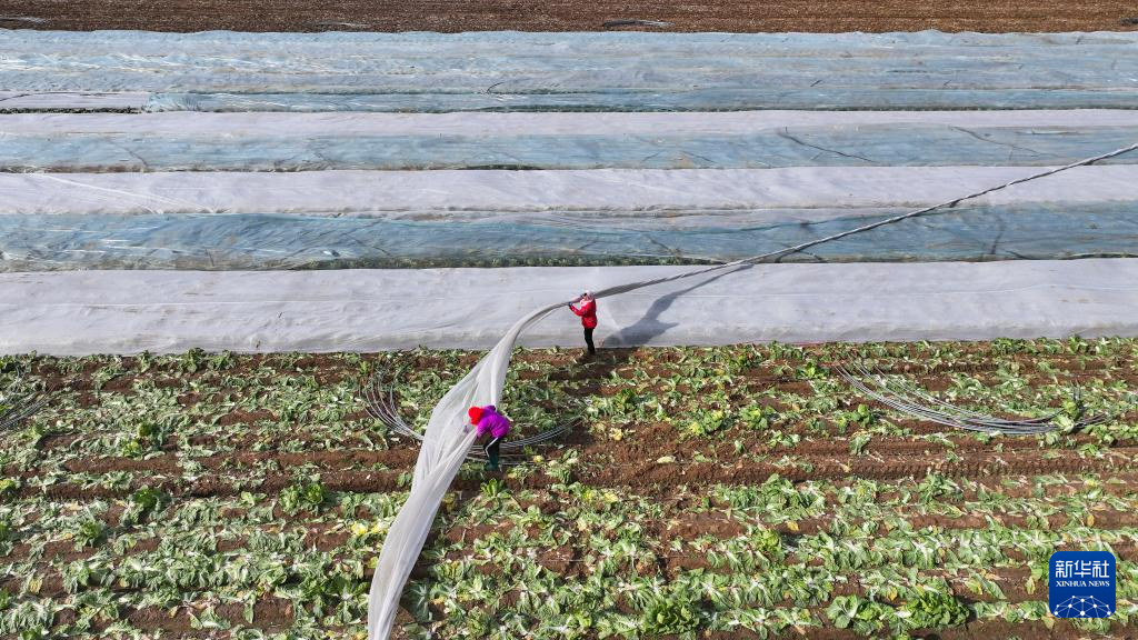 12月11日,在山东省东营市广饶县李鹊镇,农民为作物覆盖防寒无纺布(无人机照片)。