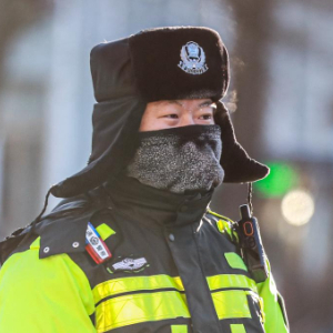 12月11日,在黑龙江省伊春市伊美区,一名交警在寒潮中指挥交通。