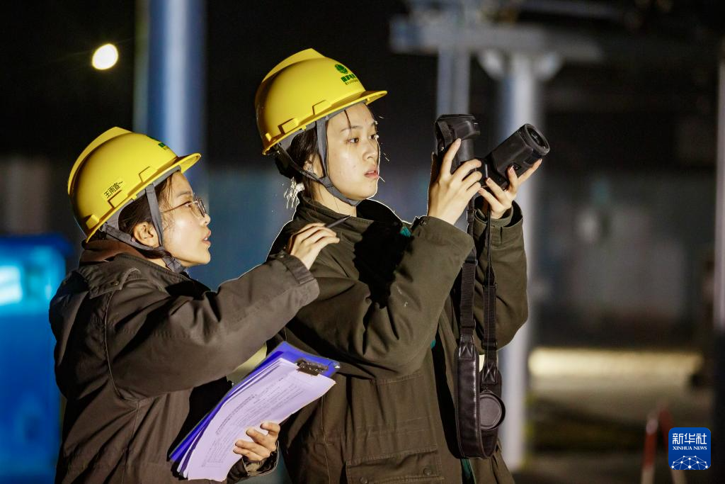 12月10日,在河南省商丘市睢县110千伏董店变电站内,国网河南省电力公司睢县供电公司工作人员在对设备开展夜巡。