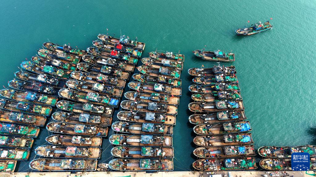 12月11日,在山东青岛西海岸新区积米崖渔港,渔船停靠在泊位上(无人机照片)。