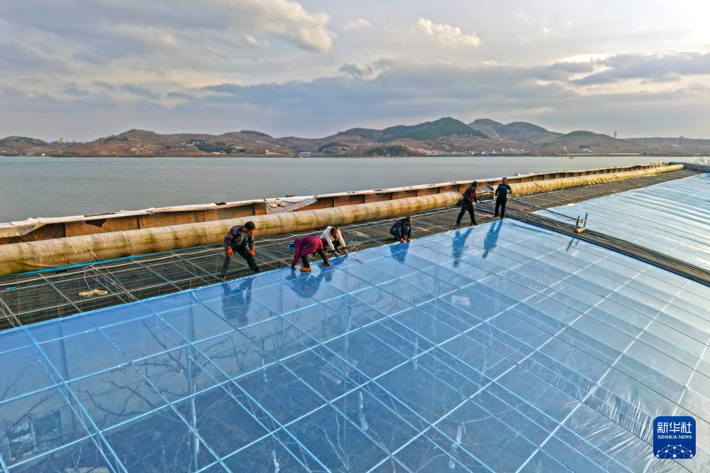 12月11日,在山东省烟台市福山区张格庄镇,农民为樱桃大棚更换新的塑料薄膜(无人机照片)。