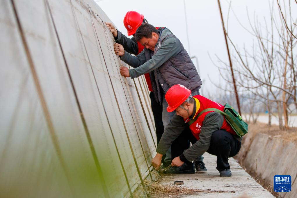 12月10日,在河南省商丘市睢县周堂镇齐庄村有机蔬菜种植基地内,国网河南省电力公司睢县供电公司“电力雷锋”志愿服务队志愿者帮助菜农加固蔬菜大棚。
