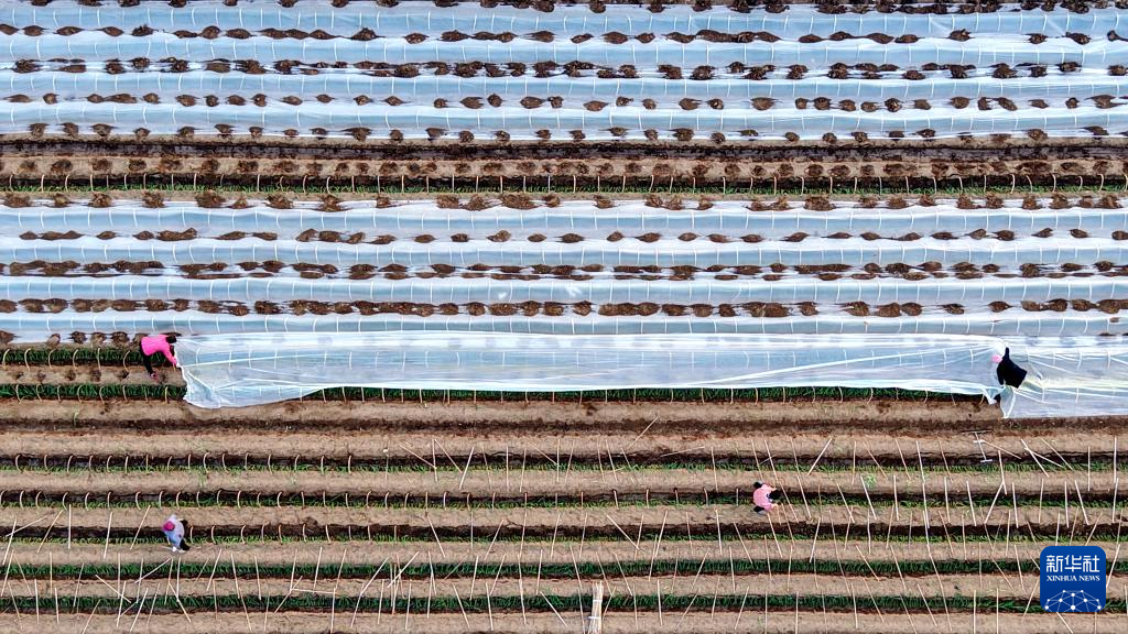 12月11日,在山东省临沂市平邑县地方镇,村民为种植的蔬菜幼苗覆盖保温薄膜(无人机照片)。