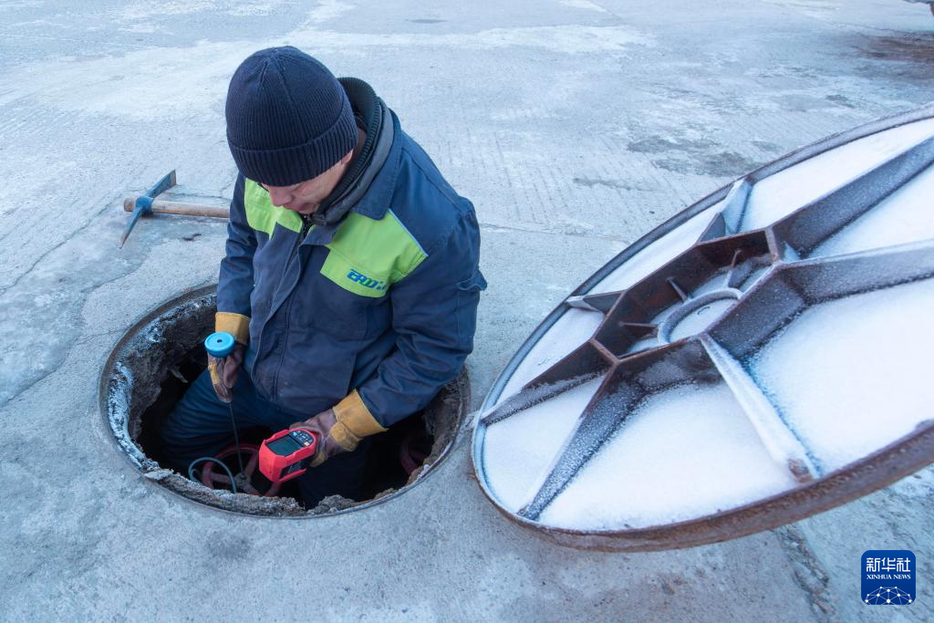 12月11日,黑龙江省富锦市一家供热企业的工作人员在巡护供热网络。