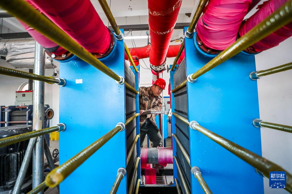 12月11日,工人在河北省唐山市海港经济开发区第七中学热力站检修换热泵。