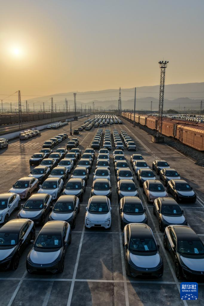 11月29日,在重庆果园港国家物流枢纽铁路货运鱼嘴站商品车物流基地,“重庆造”新能源汽车等待装入一旁的“渝车”专列出海(无人机照片)。