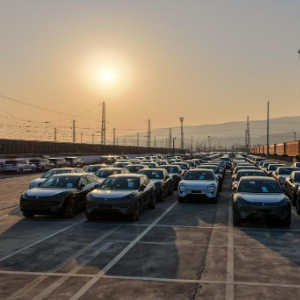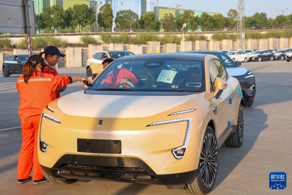 11月29日,在重庆果园港国家物流枢纽铁路货运鱼嘴站商品车物流基地,工作人员在登记即将登上“专列”的“重庆造”新能源汽车。