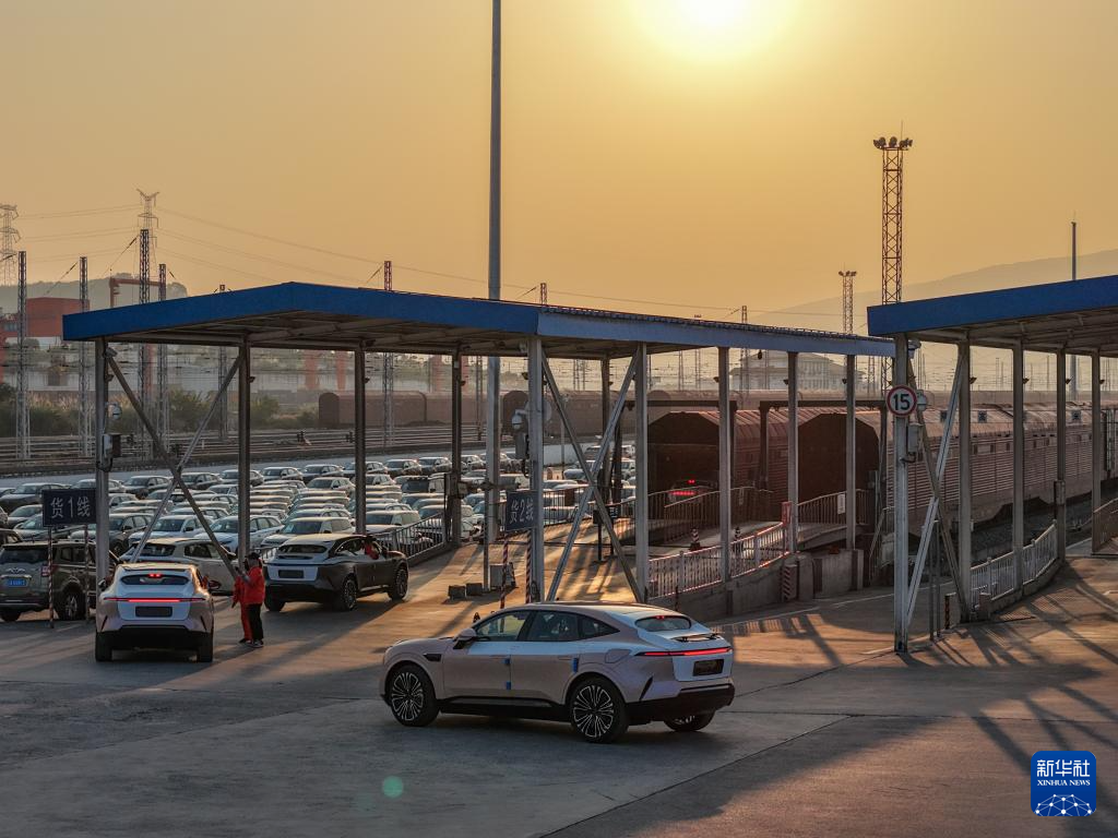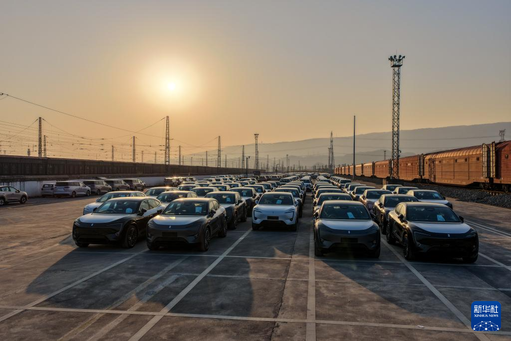 11月29日,在重庆果园港国家物流枢纽铁路货运鱼嘴站商品车物流基地,“重庆造”新能源汽车停放在专列内。
