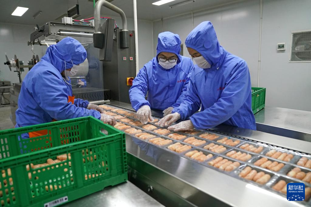 在位于江西省修水县港口镇红苏村的幕村杭猪加工基地,卢丹(中)在查看猪肉制品的生产情况(12月3日摄)。