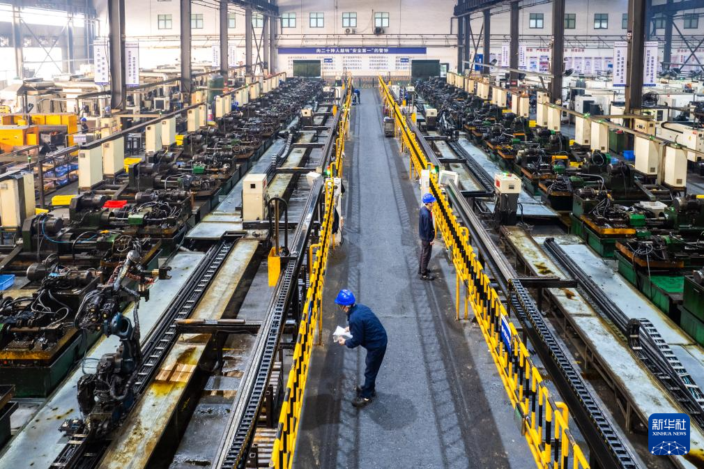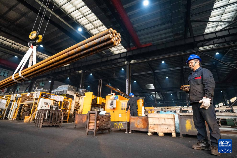 12月11日,在位于桃源县陬市镇观音桥村的湖南飞沃新能源科技股份有限公司生产车间,工人在吊运制作风机叶片紧固件产品的原材料。