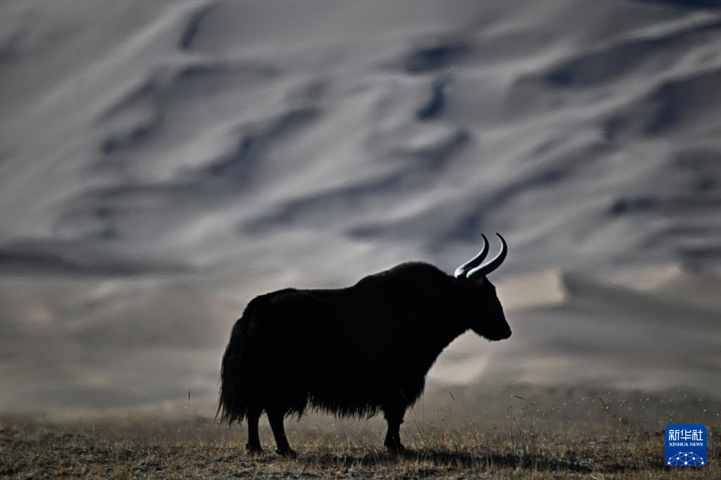 在阿尔金山国家级自然保护区,野牦牛在孟布拉克草原上觅食(12月7日摄)。