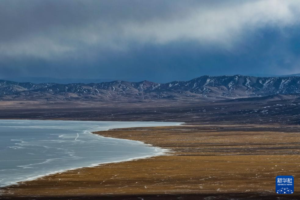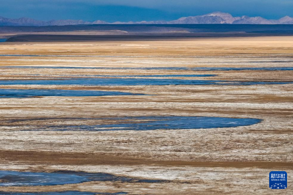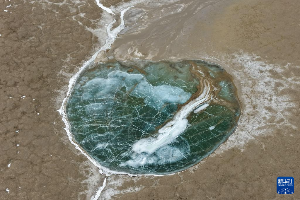 在阿尔金山国家级自然保护区,鲸鱼湖边的一处沼泽结了冰(无人机照片,12月6日摄)。