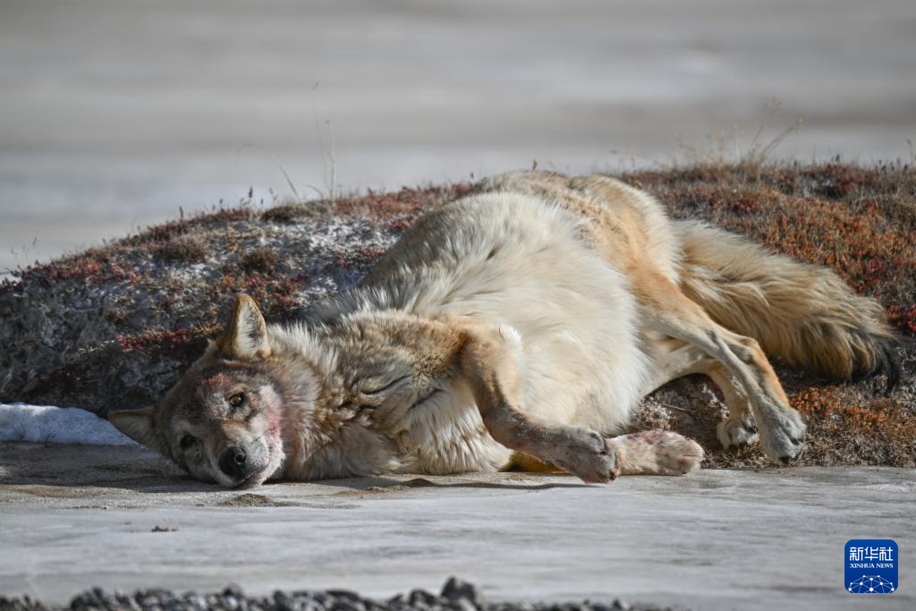 在阿尔金山国家级自然保护区,刚捕食完藏羚羊的野狼在冰面上打滚(12月6日摄)。