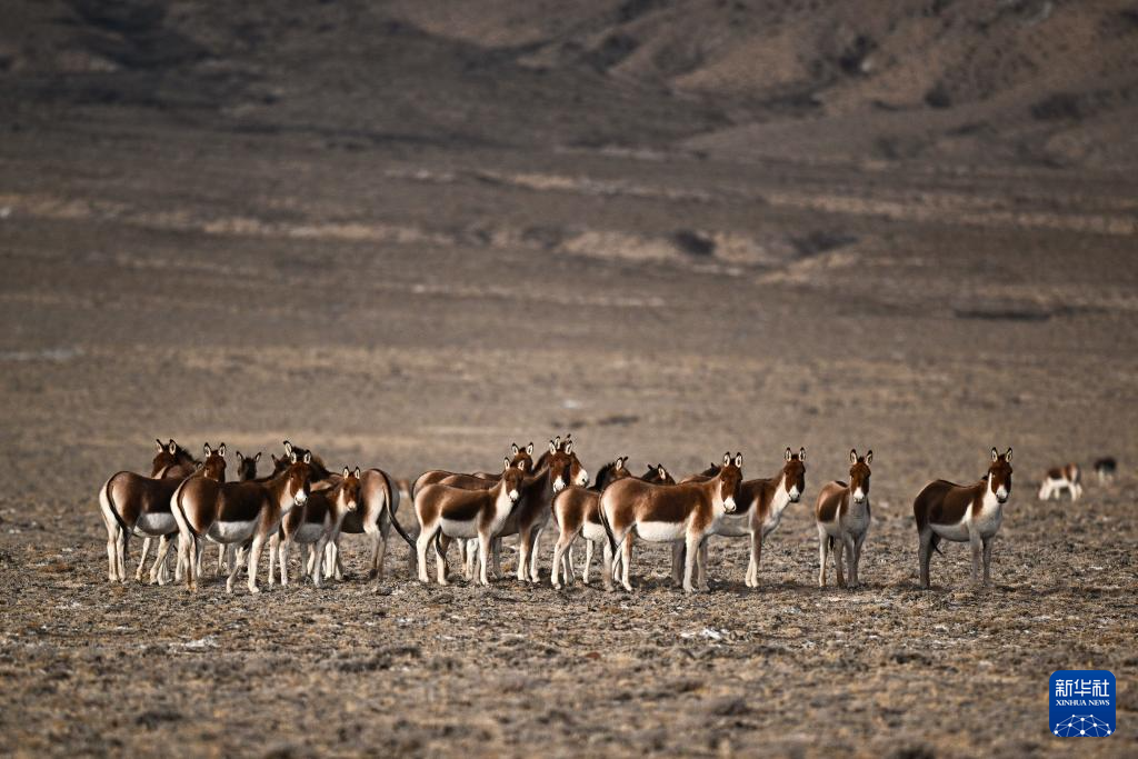 在阿尔金山国家级自然保护区,藏野驴在草原上觅食(12月9日摄)。