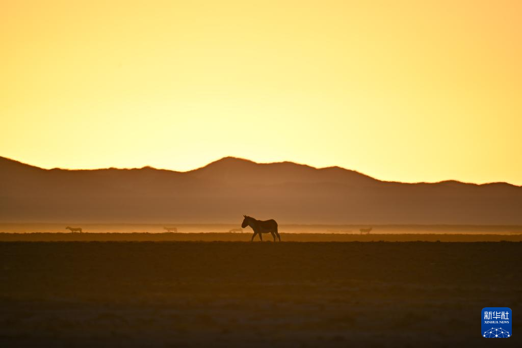 在阿尔金山国家级自然保护区,藏野驴在日出时的依协克帕提草原上觅食(12月9日摄)。