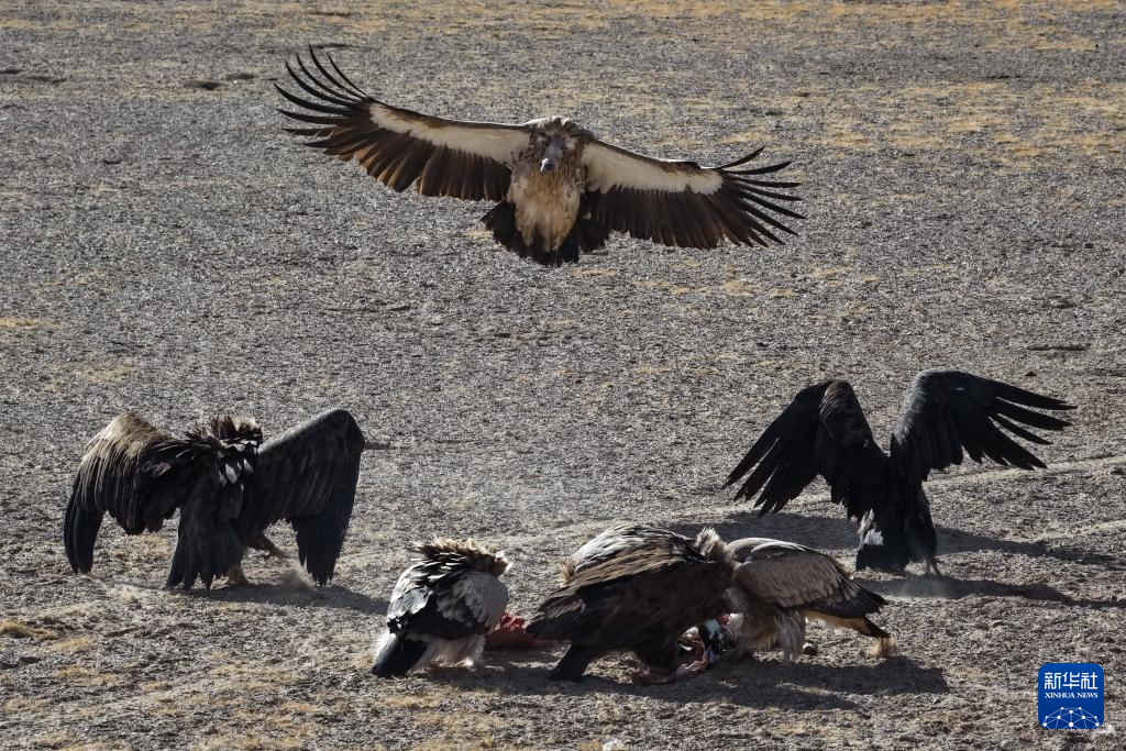 在阿尔金山国家级自然保护区,秃鹫和高山兀鹫在啃食一只藏羚羊的残骸(无人机照片,12月6日摄)。