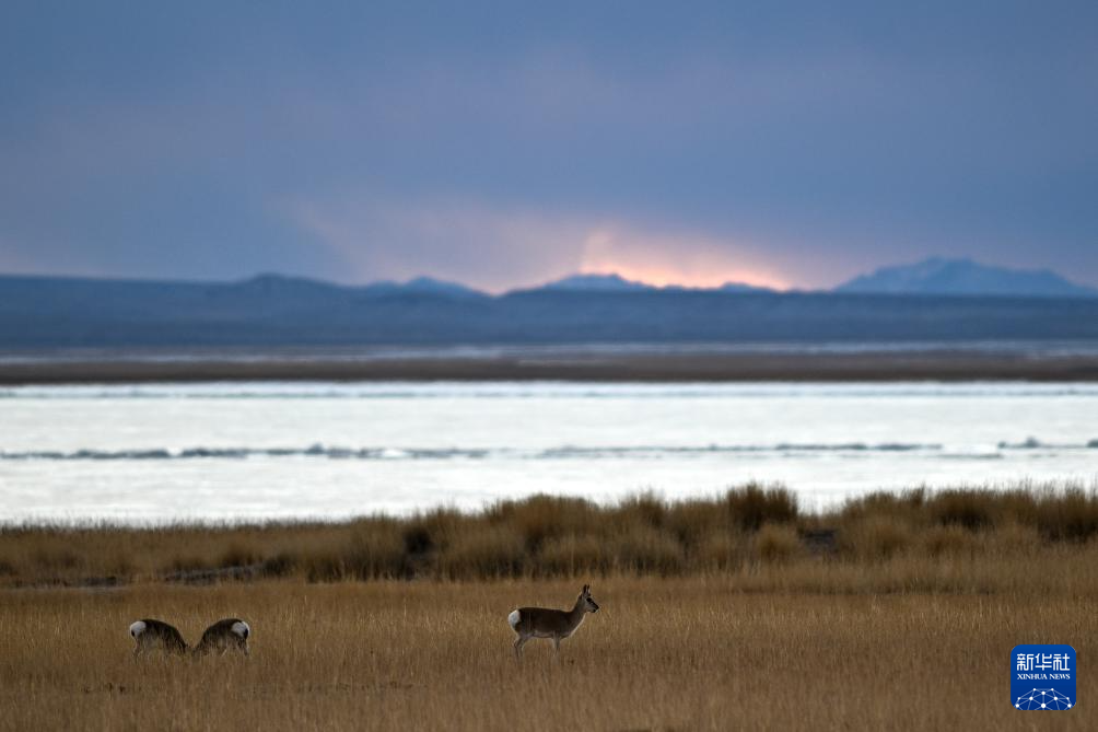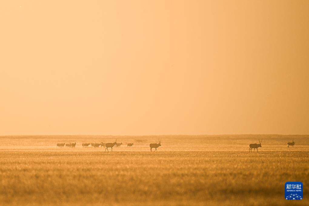 在阿尔金山国家级自然保护区,藏羚羊在清晨的孟布拉克草原上觅食(12月7日摄)。
