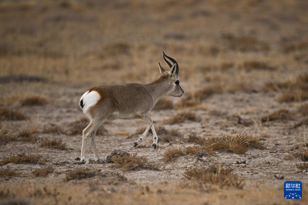 在阿尔金山国家级自然保护区,藏羚羊在草原上觅食(12月5日摄)。