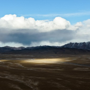 在阿尔金山国家级自然保护区,阳光穿过云层照耀在阿尔喀山前的大地上(无人机照片,12月6日摄)。