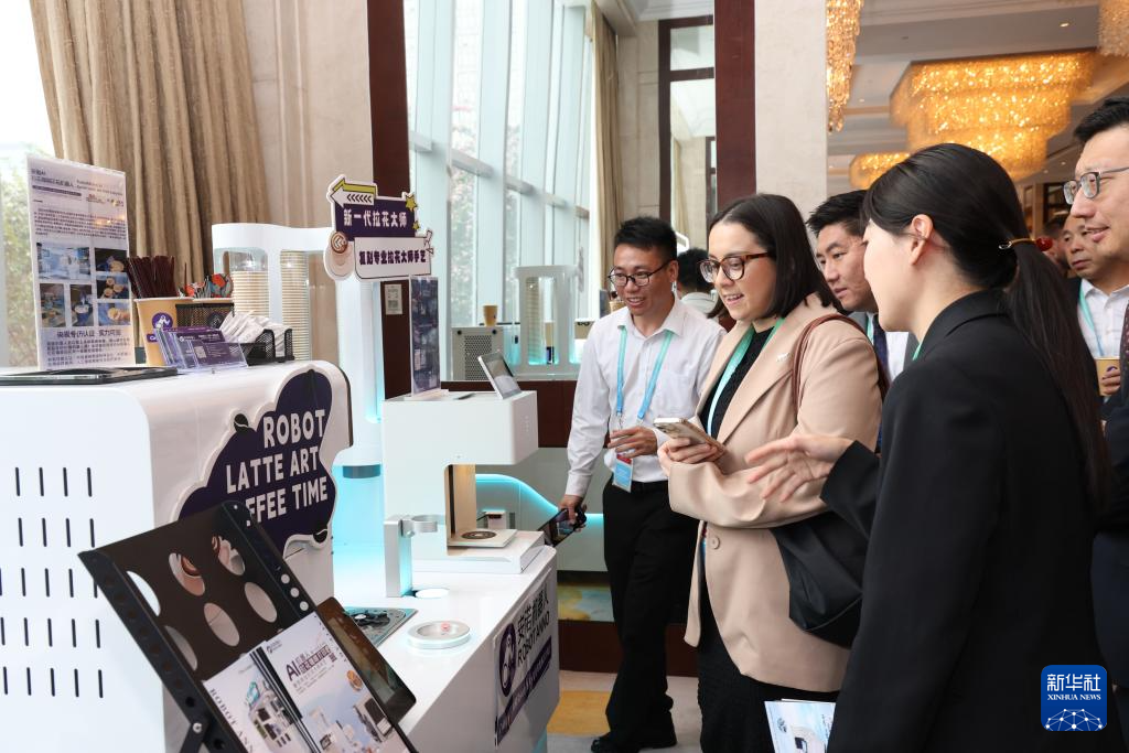 12月11日,嘉宾在会议间隙体验咖啡机器人。