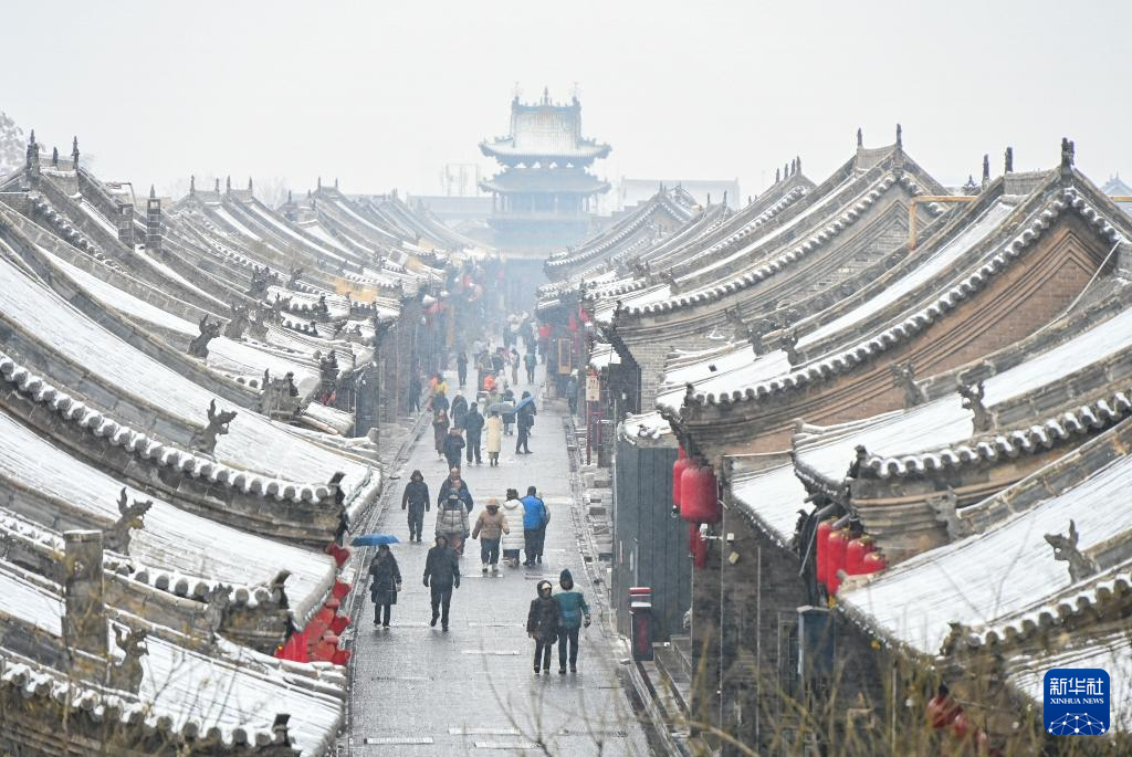 12月12日,游客冒雪在位于山西省晋中市的平遥古城游览观光。