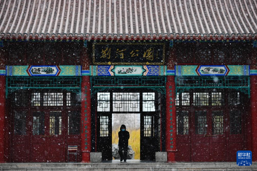 12月12日,环卫工人在河北省石家庄市正定古城南城门清扫积雪。