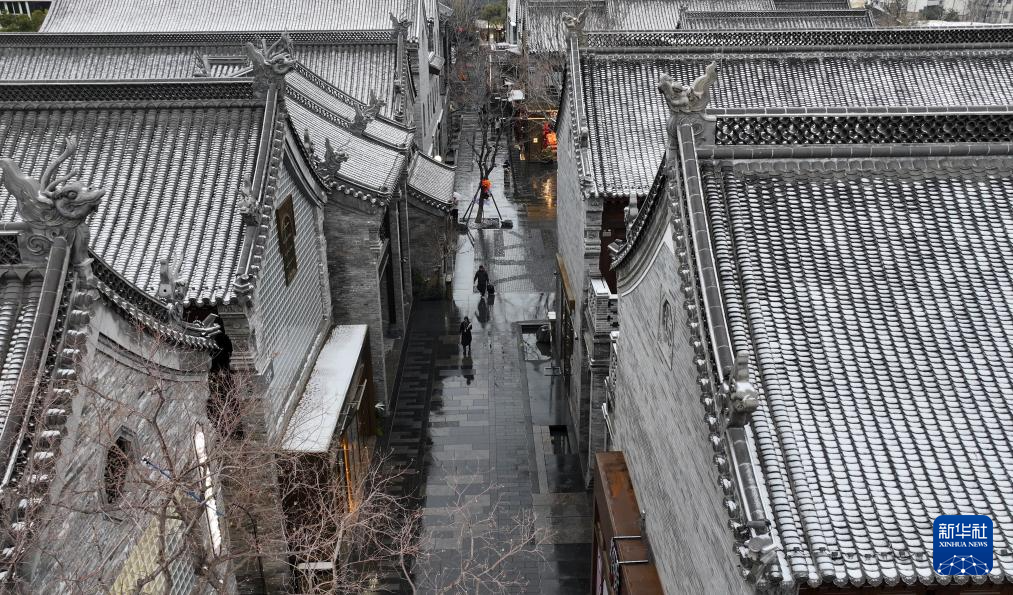 12月12日拍摄的雪中的郑州市“亳都·新象”街区。