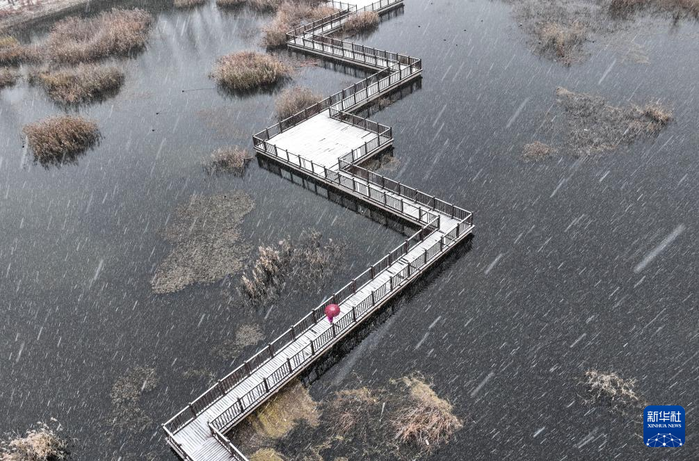 12月12日,市民在河南省济源市曲阳湖赏雪(无人机照片)。